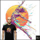 Style & Background: The figure is set against a large, glowing orange/yellow circular shape, which acts as a radial backdrop. Colorful streaks and splatters of pink, blue, yellow, and orange radiate outwards, emphasizing the energy of the movement. The style is intense, graphic, and uses a neon pop art aesthetic.