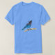 Una broma de Steller. Este notable pájaro azul está representado en una acuarela y se sienta en una rama gruesa. El pájaro mira hacia atrás, lo que crea una posición interesante.