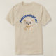 Porcelain teddy bear with blue “Please adopt me” text on beige t-shirt.