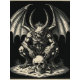 Un demonio alado con cuernos se agazapa en una negrura total, su forma muscular y esquelética tallada con detalles ásperos. Manos con garras protegen una calavera agrietada debajo, evocando ritual, dominación y terror en una visión gótica inspirada en grabados en madera de un terror mítico crudo.