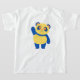 Un panda lindo y estilizado con un cuerpo amarillo brillante y miembros azules sobre un fondo blanco, ondeando su pata izquierda en un saludo amistoso. El panda tiene orejas interiores y parches para los ojos naranjas, y una cara simple y sonriente con una nariz y boca pequeñas.