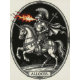 Un guerrero con cabeza de león cabalga sobre un corcel cornudo, respirando fuego y blandiendo un arma con púas. Una figura imponente de autoridad mítica, que encarna la batalla, el espectáculo y la fuerza sobrenatural.
