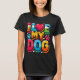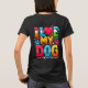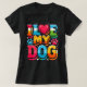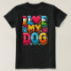 El diseño de la camiseta muestra la frase "Amo a mi perro" en tipografía atrevida y juguetona. La palabra "amor" está representada por un gran corazón rojo, que añade un vibrante pop de color. Alrededor del texto hay adorables huellas de pata y pequeños ilustraciones relacionados con perros como huesos y un collar para perros. El diseño es sencillo, cálido y perfecto para expresar el afecto del dueño de un perro en un estilo divertido e informal.