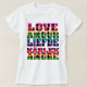 ¿Te gustan las camisetas con un mensaje positivo? Esta camiseta dice amor en una variedad de idiomas, incluyendo inglés, francés, holandés, sueco e italiano con corazones de color neón.