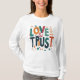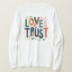 Exprese sus valores con esta elegante camiseta de manga larga. Con un significativo mensaje de "amor y confianza" en la parte delantera y un vibrante gráfico de Amor Verde en la parte trasera, esta camisa es perfecta para el uso diario. Elaborado con materiales suaves y cómodos, ofrece un ambiente relajado y un toque de estilo sin esfuerzo.