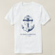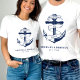 Camiseta de parejas de luna de miel de boda azul náutico y blanco. Ideal para una boda en el lago o en la Marina (militar). El diseño cuenta con un ancla envuelta en un banner con el texto "Anclado en el amor". Personalízalo con los detalles de tu boda.