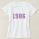 Elegante camiseta de moda "1986" de personalizado de nacimiento en moderna tipografía minimalista en bloques de negrita estilo universitario en púrpura lila. El regalo de cumpleaños perfecto para celebrar su año de nacimiento, establecimiento y cosecha, que puede ser fácilmente personalizado con su propio año.