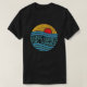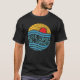Esta prenda negra presenta un diseño circular con una estética retro. Un sol rojo se eleva o se pone sobre las estilizadas olas azules, con un cielo amarillo y ondulado encima. El texto "AQUÍ VIENE EL VERANO" está sobre el agua. Esto evoca una sensación de clima cálido y de temporada de playa.