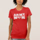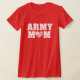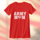 This t-shirt features the text "ARMY MOM" with a heart shaped flag instead of the "O" in the "MOM" text. This tee helps show your pride and support for our military men and women who are serving on behalf of the Army. The design is shown here in white on a red tailored tee shirt but you can opt for a sweatshirt, a long-sleeve tee, and other designs and colors. If you choose a white tee, then change the border color of the design to a darker color.