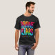 El diseño de la camiseta "Arrange Rides" incluye la frase en letras negrita y multicolor, arregladas de manera lúdica y dinámica. Los colores son vivos y llamativos, por lo que el diseño destaca. El estilo general es moderno y enérgico, perfecto para una empresa rideshare o cualquier persona que desee viajar.