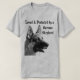 Una imagen majestuosa de un pastor alemán, con un bozal negro, y palabras de su opción. El texto sugerido es, amado y protegido por un pastor alemán.