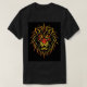 Representación artística impactante de la cabeza de un león sobre un fondo negro. El león se representa con colores vibrantes, principalmente rojos, amarillos y naranjas, creando una apariencia ardiente. La melena se exagera con líneas fluidas, lo que añade una cualidad dinámica al diseño. Los rasgos faciales son fuertes y audaces, mostrando una expresión feroz, con ojos penetrantes y bigotes prominentes.