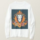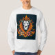 Cabeza de león estilizada en el centro, adornada con una corona. La melena del león está ilustrada con colores naranja y amarillo vibrantes, que se asemejan a llamas.