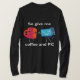 diseño de camisetas con la imagen de una taza de café y una computadora pc de alto cinco años al estilo personalizado. texto: "dame café y pc"