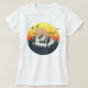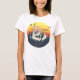 Ilustracion de montaña estilo retro al atardecer diseño con picos de montaña, pájaros, sol, pinos decoración de color rayado estilo retro