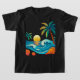 Una vibrante escena tropical de verano con cielos dorados, olas oceánicas onduladas y siluetas de palmeras. Los tonos cálidos naranja y rosa se mezclan con el agua azul, lo que confiere un ambiente relajante a la playa. Ideal para los amantes del verano, los amantes del surf y los amantes de las vacaciones tropicales. Este diseño da vida a la belleza de la puesta de sol en el mar con una atmósfera tranquila pero energizante.