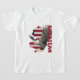 Esta camiseta para niños presenta un diseño gráfico dinámico de un águila a mitad de vuelo con sus alas extendidas, superpuestas a la silueta de un esquema de mapa de los Estados Unidos. El fondo incluye una bandera americana con rayas rojas y blancas y un campo azul con estrellas. La palabra "AMERICANO" aparece de forma prominente en el diseño en negrita y letras mayúsculas. Este diseño simboliza el orgullo y la identidad estadounidenses, lo que la convierte en una elección perfecta para los jóvenes patriotas.
