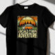 el diseño de camisetas de estilo vintage con una camioneta retro camper que recorre un bosque con fondo de puesta de sol y la frase "aventura del viaje por carretera" 🚐 🌲 🌅