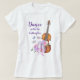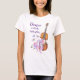 Una camiseta con la cita inspiradora que dice: Baile con las mariposas. Ilustrado con una acuarela que representa un violín de madera, algunas zapatillas de ballet rosadas descansan sobre él y decoradas con flores y mariposas.