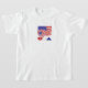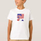 Camiseta para niños con la bandera de los Estados Unidos de América vuela detrás de una pelota de fútbol o fútbol europeo. La pelota también está en los colores de la bandera estadounidense. Debajo, las letras de Estados Unidos muestran en rojo, blanco y azul, respectivamente. Las letras están delineadas en gris, para mostrarlas bien en más de un fondo de color.