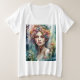 La imagen representa a una joven rodeada por un bosque eéreo y de ensueño. Tiene una corona de flores coloridas en la cabeza, que se mezcla armoniosamente con el suave fondo acuarela de árboles y flores. El estilo artístico es muy cuidado y pintoresco, con un ambiente surrealista y encantador.