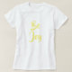 Camiseta blanca con "Be Joy" en texto amarillo.