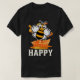 Esta camiseta negra muestra una linda abeja personalizado con ojos grandes y una sonrisa amistosa, zumbando cerca de un grupo de panecillos amarillos y naranjas. Las palabras "Bee Happy" se escriben en un estilo de letra lúgubre, reforzando un tema alegre y optimista. Es un diseño delicioso que aporta un toque de fantasía.