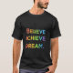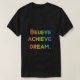 Este inspirador diseño de camisetas muestra la frase "Believe Achieve Dream" en letras negrita y multicolor contra un fondo dinámico y abstracto. El diseño transmite un mensaje de esperanza, determinación y el poder de los sueños para dar forma al futuro. Alienta a los usuarios a creer en sí mismos, fijar metas ambiciosas y trabajar arduamente para lograr sus aspiraciones.