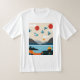 Geometric illustration featuring birds flying over a lake with snow-capped mountains in the background. Stylized, red faces appear in the sky, resembling suns. The scene is framed by evergreen trees and vibrant plants in the foreground, surrounding a small hut with a thatched roof. The composition uses bold colors such as blue, red, orange, and black, creating a modern, abstract visual effect.