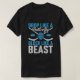Camiseta de portero de hockey con texto azul y blanco, casco con máscara, patines y palos de hockey dice Suelta como una mariposa ¡Como una bestia!