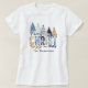 Camiseta de mujeres cristianas navideñas con diseño de tipografía y modernos árboles de Navidad azules, cruz y apellido personalizado. Personaliza fácilmente el nombre - Kate Eden Art