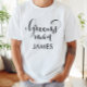 La camiseta del boda Groomsman presenta escritura moderna de caligrafía giratoria negra con elegante texto de primer nombre personalizado que puede personalizar. ¡Vea nuestros diseños coordinados de la fiesta nupcial!