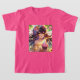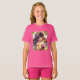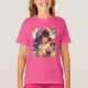 Chica animada con el pelo castaño largo, flores en el pelo, una camiseta chica de cumpleaños de bizcocho rosa y chocolate.