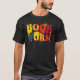 El color es muy bonito al natural, como la foto. El tejido es suave y de buena calidad. Sin defectos en el tintado, ni hilos sueltos o descosidos. Bien la impresión. Los bordes de las letras y el dibujo son nítidos, y el color contrasta muy bien con el de la camiseta.