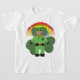 Esta camiseta para niños es ideal para celebrar el Día de San Patricio, cuenta con un Leprechaun verde personalizado con un Shamrock y un arco iris sobre un fondo blanco.