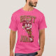 El color es muy bonito al natural, como la foto. El tejido es suave y de buena calidad. Sin defectos en el tintado, ni hilos sueltos o descosidos. Bien la impresión. Los bordes de las letras y el dibujo son nítidos, y el color contrasta muy bien con el de la camiseta.