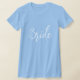 La camiseta de las mujeres se muestra en el cuello de la tripulación y en mangas cortas en azul bebé con texto blanco: Novia. Personalizar este artículo o compra tal cual.