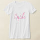 La camiseta de las mujeres se muestra en el cuello de la tripulación y en mangas cortas en blanco con texto rosa: Novia. Personalizar este artículo o compra tal cual.