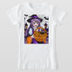 Este ilustracion vibrante tiene un carácter de bruja de estilo anime, con el pelo largo y el vello violeta y los ojos rojos brillantes. La bruja está vestida con los colores tradicionales de Halloween, incluyendo un gorra morado con una cinta a juego, una blusa blanca y un vestido negro y violeta con mangas naranjas. Sostiene una gran cesta tejida con pequeñas calabazas, y una araña negra con ojos amarillos brillantes le da un toque espeluznante. El fondo muestra una escena nocturna con árboles oscuros y retorcidos y casas espeluznantes iluminadas, que capturan perfectamente el espíritu de Halloween. La obra de arte se detalla con líneas nítidas y una paleta de colores vívidos, lo que la hace ideal para impresiones, pegatinas y otros artículos.