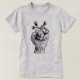 Camisa de mano picante con un dibujo de tinta que representa una mano en puño con uñas negras afiladas y un anillo negro con monstruos malvados con dientes afilados. Un ilustracion trepidante y divertido con un toque gótico.