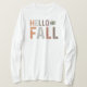 Este diseño de otoño da la bienvenida calurosamente a la temporada de otoño con la frase "Hello Fall". Las palabras están dispuestas en un diseño simple pero visualmente atractivo, con "Hello" colocado sobre "Fall". Cada letra de la frase se presenta en un tipo de letra atrevido y bloqueante con una textura un poco angustiada, dándole una apariencia rústica y caprichosa que complementa el tema otoñal.
