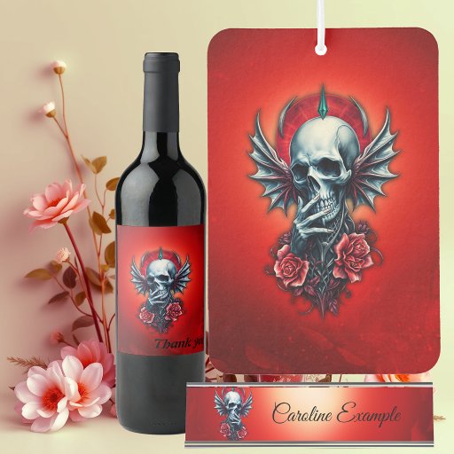 Cráneo impresionante y realista con alas colocadas en el centro de la composición. El cráneo se detalla con detalles meticulosos que destacan las finas estructuras de los huesos y la textura del cráneo. Las superficies están acabadas con sutiles tonos azules y grises que dan profundidad y dimensión al cráneo. Estos matices de color crean un fascinante contraste con el fondo rojo brillante y resaltan la estética sombría del diseño.