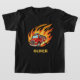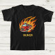 Esta alegre camiseta personalizada para niños presenta un camión de bomberos rojo atrevido al estilo personalizado rodeado de llamaradas estilizadas que se curvan y parpadean. Las llamas son tonalidades vibrantes de naranja, rojo y amarillo, dando un sentido de movimiento y energía.