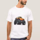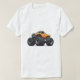Un poderoso camión naranja monstruo con neumáticos masivos y suspensión lista para enfrentar cualquier obstáculo.