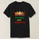 Camiseta masculina con el texto "Conoce mi valor" en colores africanos, con una corona dorada en la parte superior. La parte trasera tiene un signo de dólar dorado.