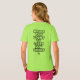 Frase de motivación en los lados frontal y posterior de las camisetas con una cita: "Nunca demasiado joven para aprender cosas nuevas". La imagen trasera es personalizable.