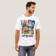 Esta camiseta blanca tiene cuatro secciones verticales distintas que representan una experiencia de camping en diferentes momentos. Empezando por la izquierda: un bosque a la luz del crepúsculo, una clásica camioneta de camper estacionada en un soleado prado, una fogata a orillas del lago bajo un colorido cielo nocturno y una acogedora tienda iluminada por una linterna en la noche con luna llena. Las palabras "MODO DE CAMPING" están en la parte inferior de una letra estilizada.