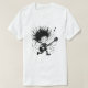 Presenta un personaje de caricatura con cabello tremendamente exagerado, atrapando una guitarra con una expresión de emoción y un ligero caos. Utilizar el estilo de arte de líneas para ilustrar el caos circundante con notas musicales giratorias y elementos abstractos dispersos como zigzags y swirls. Las características del personaje y los elementos que lo acompañan