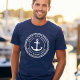 Camiseta azul marino con un emblema blanco y elegante de ancla y cuerda con tu nombre personalizado y nombre del barco.
