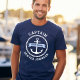 Camiseta azul marino con ancla náutica blanca rodeada de un borde de cuerda. Al otro lado del ancla hay una cinta azul claro con el nombre de tu barco. Agregue el título, por ejemplo capitán, en la parte superior y un nombre personalizado en la parte inferior.